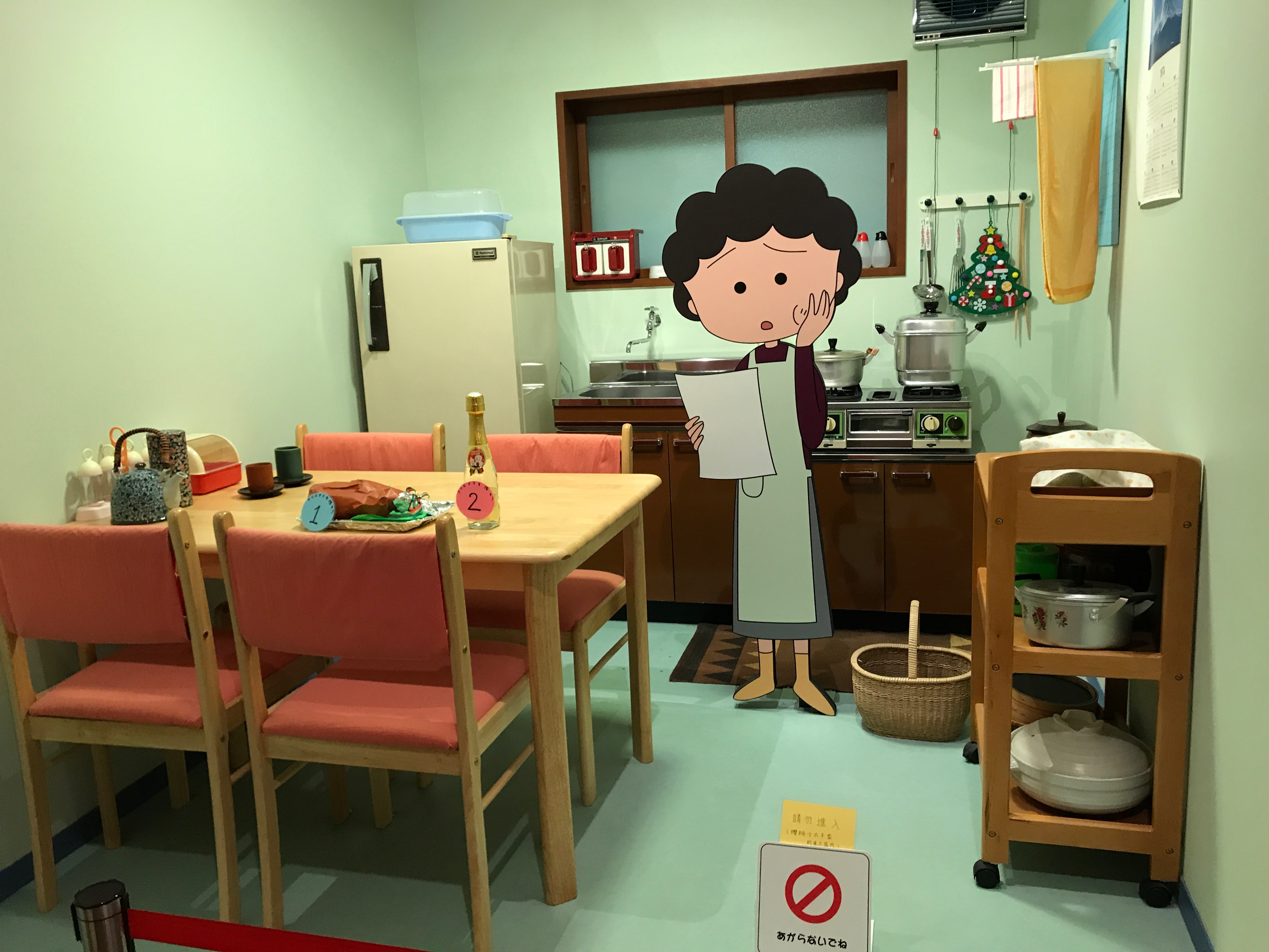 마루코 인형이 있고, 아래엔 절대 만지지 마세요라고 붙어있다.